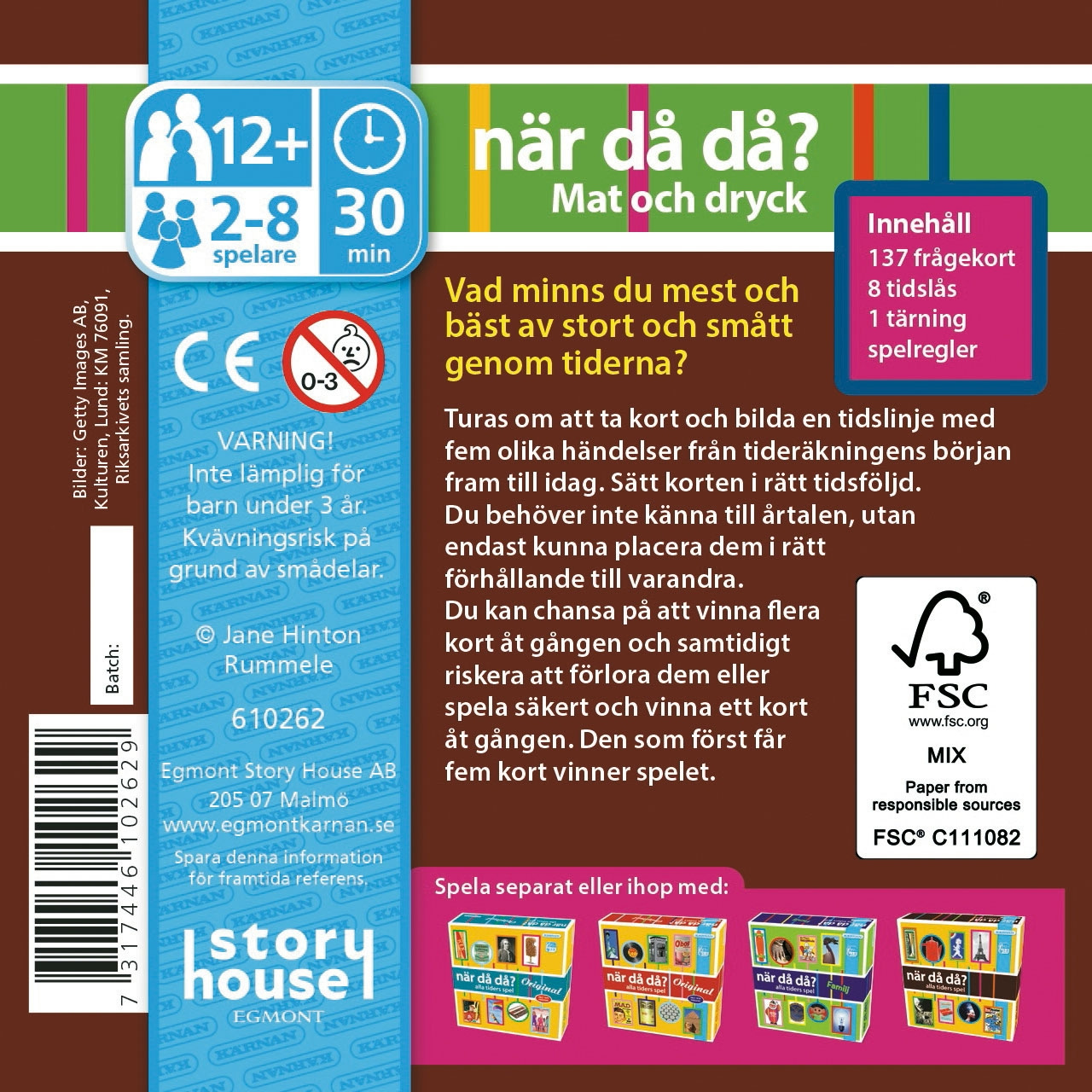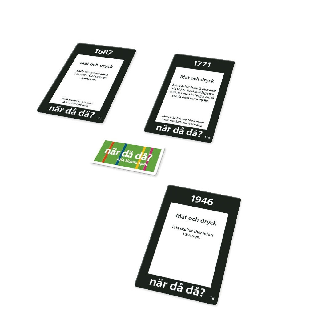 Udfordr din hukommelse og historiske viden med dette spil i lommeformat. Spillerne skiftes til at trække kort og skabe en tidslinje med fem forskellige begivenheder fra tidernes morgen til i dag. Målet er at placere kortene i den rigtige kronologiske rækkefølge uden at skulle kende de nøjagtige årstal. Du kan vælge at tage chancer ved at forsøge at vinde flere kort på én gang eller spille sikkert og vinde ét kort ad gangen. Den første spiller, der placerer fem kort korrekt, har vundet spillet. Spillet er designet til 2 eller flere spillere og egner sig fra 12 år og opefter, hvilket gør det til en sjov og lærerig aktivitet for familie og venner.