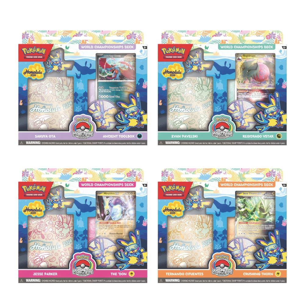 Få fat i et verdensmesterskabsspil og spil som en mester! Vælg et af fire stærke kortspil, som hver især er en kort-for-kort-kopi af en faktisk titelkandidats fra verdensmesterskaberne i 2024 Pokémon Trading Card Game i Honolulu!