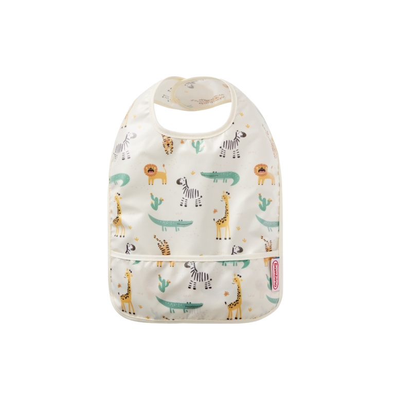 Her er en dejlig tilføjelse til din lille ones måltidsrutine – hagesmækken "Bambino"! Denne charmerende hagesmæk er designet til at gøre måltiderne både sjove og rene, med et livligt junglemotiv, der helt sikkert vil bringe et smil frem på dit barns ansigt.