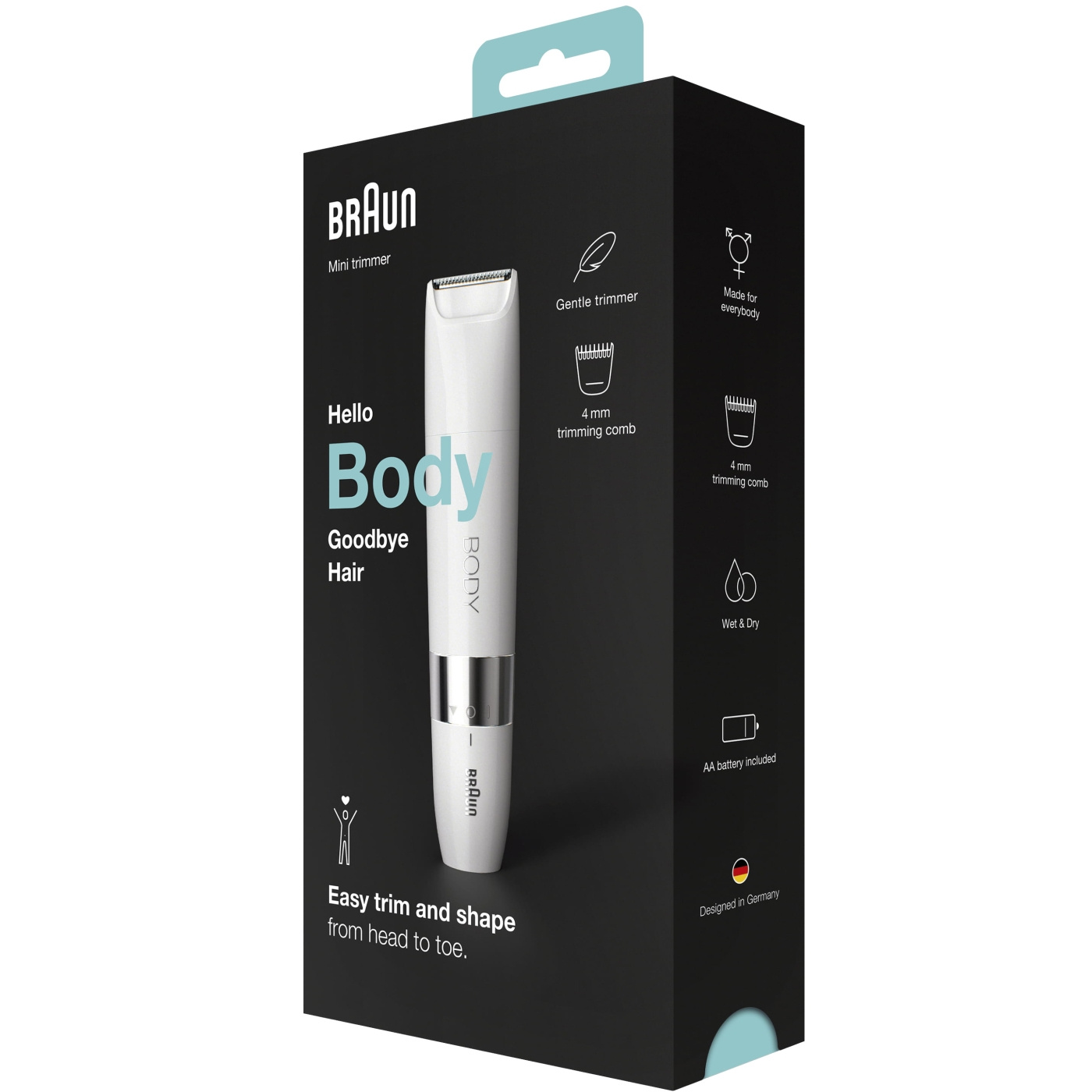En funktionell kroppshårstrimmer i mini-format för alla som ger snabba, enkla och skonsamma resultat – även i känsliga områden. Brauns Mini-trimmer klipper med precision, vilket ger dig nära kontroll över hårets längd. Snabb och skonsam kroppshårstrimning: var som helst, när som helst.