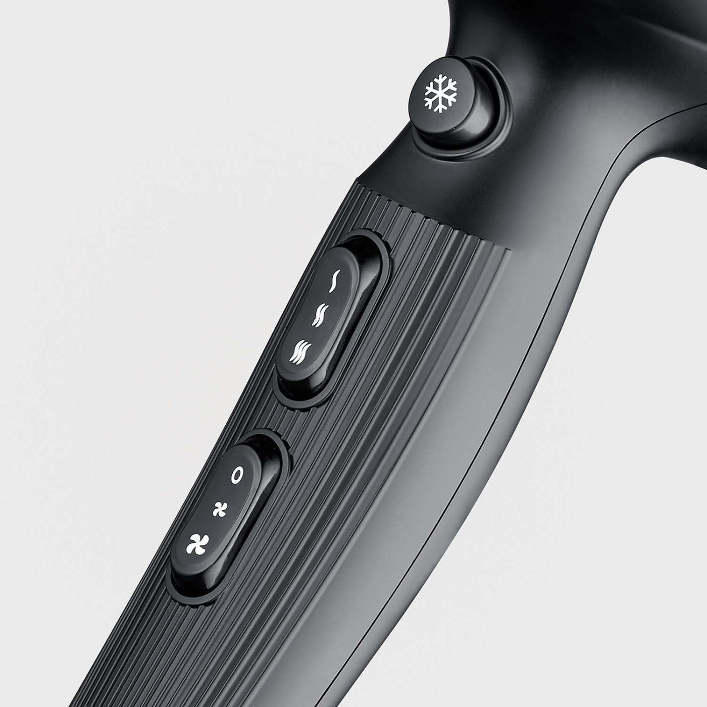Oavsett om du föredrar en skonsam torkning eller ett starkt luftflöde, erbjuder vår hårtork tre temperaturinställningar och två effektlägen. Med dessa alternativ kan du enkelt anpassa torkningen efter dina specifika behov. Använd kalluftsknappen för att fixera din frisyr och ge den det perfekta avslutet.