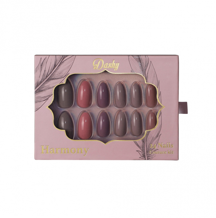 Dashy's Harmony kunstige negle har en blanding af 4 forskellige nude farver. Skaber et harmonisk og smukt udtryk. Medium længde. Indeholder 24 negle i 12 størrelser + lim & manicuresæt. Få dit personlige look med Harmony!
