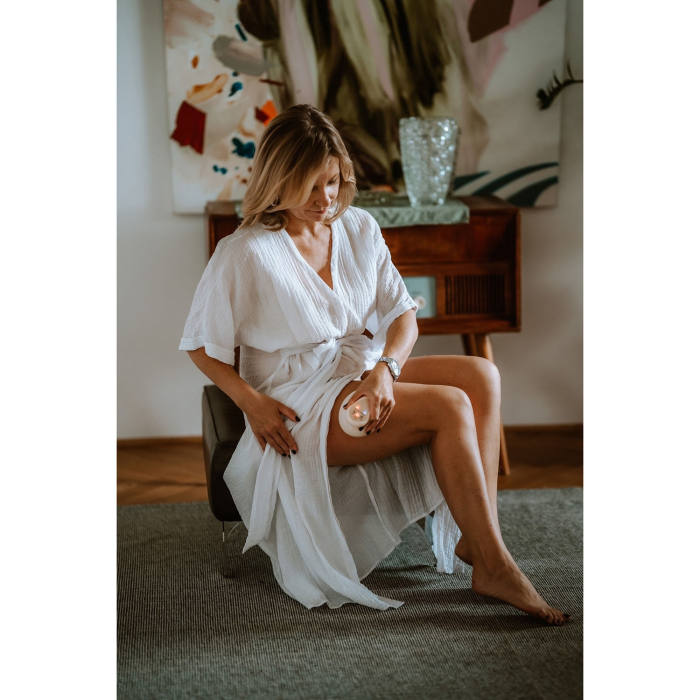 Med seks justerbare intensitetsniveauer kan du tilpasse massagestyrken, så den passer til dine individuelle behov. Dermomassageeffekten opstrammer og udglatter huden yderligere og giver et professionelt touch til dine hjemmebehandlinger. Dens alsidige anvendelse gør den velegnet til brug på forskellige kropsområder, herunder mave, lår, balder, arme, ryg og fødder.