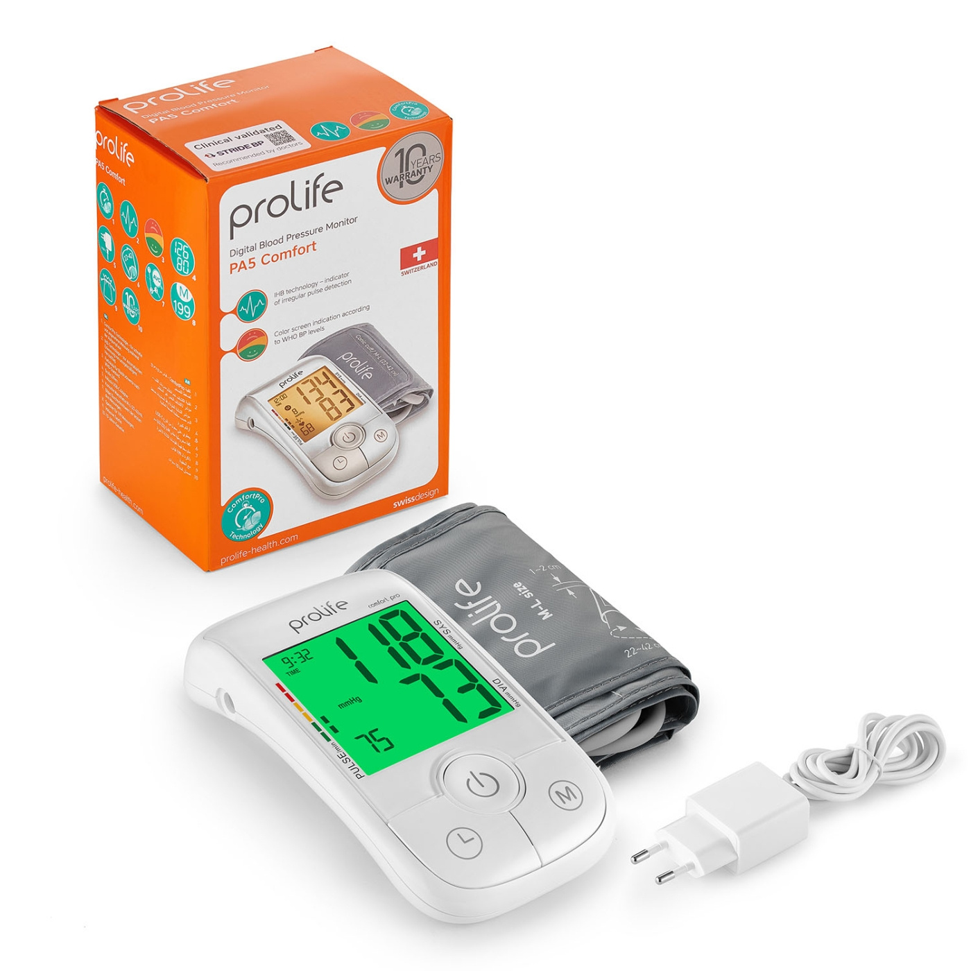 Denne digitale blodtryksmÅler fra PROLIFE har ComfortPro-teknologi, som begynder at mÅle dit blodtryk, mens manchetten pustes op, for at minimere ubehag og Øge bekvemmeligheden. IHB-teknologien er i stand til at registrere arytmi, hvilket sikrer pÅlidelige resultater, selv nÅr der er uregelmÆssig puls. Hvis arytmiindikatoren vises ofte, anbefales det at konsultere en lÆge.