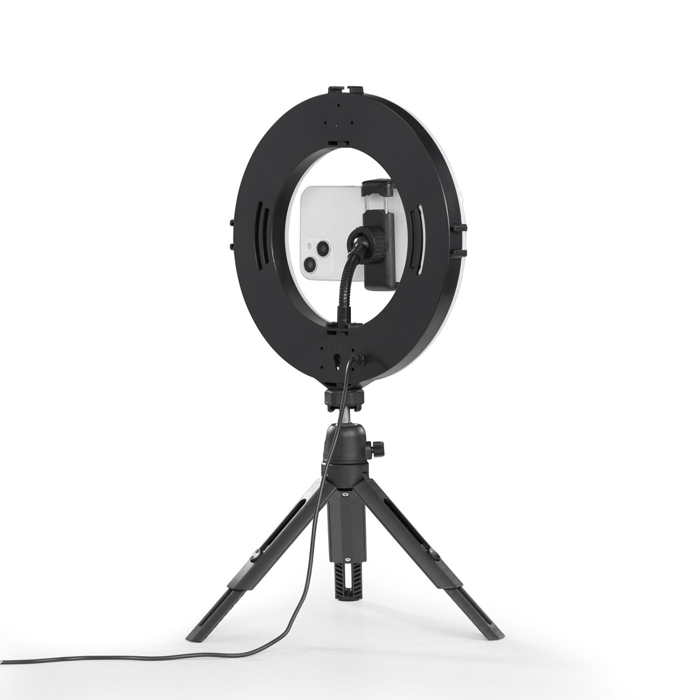 Ringlyset monteres med et kuglehoved på stativet, så det kan drejes og vippes til uendelige optagevinkler. Smartphone-holderen med kuglehoved og fleksibel svanehals sikrer den perfekte optageposition i både stående og liggende format. Derudover har ringlyset to ¼"-tilslutningsmuligheder og fire cold shoe-tilslutninger, hvilket giver fleksibilitet til at kombinere og placere udstyr som webkameraer og mikrofoner samt tilføje yderligere tilbehør til professionelle og kreative fotos og videoer.
