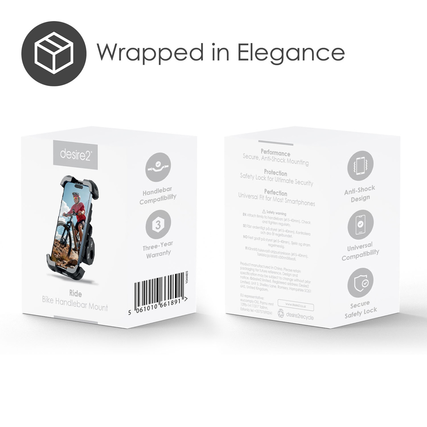 Mobilholder til cykelstyret fra Desire2 giver sikker, stødsikker beskyttelse af din enhed.