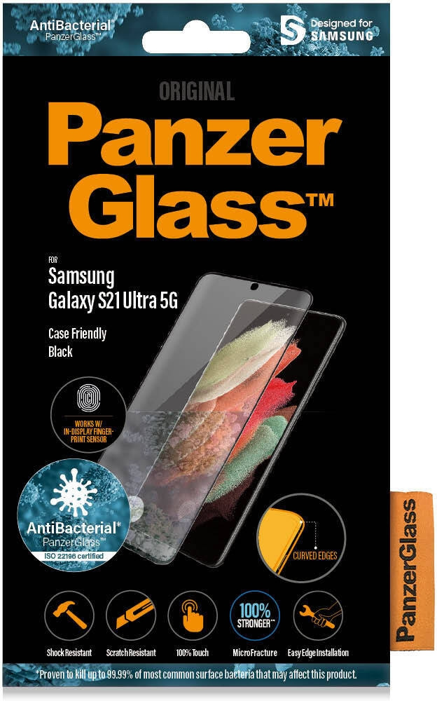 En tynd, stødabsorberende glasfilm, der beskytter hele telefonens skærm... PanzerGlass Premium glasfilm er ridsefast, beskytter mod slag på skærmen og er ni gange mere holdbar end almindeligt glas. Den er kun 0,4 mm tynd. Glasfilmens belægning forhindrer fingeraftryk og andet snavs i at sætte sig fast på overfladen og gør den lettere at rengøre. Fuldt gennemsigtig krystalklar glasfilm. Touchskærmens berøringsfølsomhed forbliver 100 % nøjagtig med glasfilmen, der beskytter skærmen. Hurtig og nem at installere med klare installationsinstruktioner. Biometrisk glas gør det muligt at genkende fingeraftryk gennem glasfilmen.