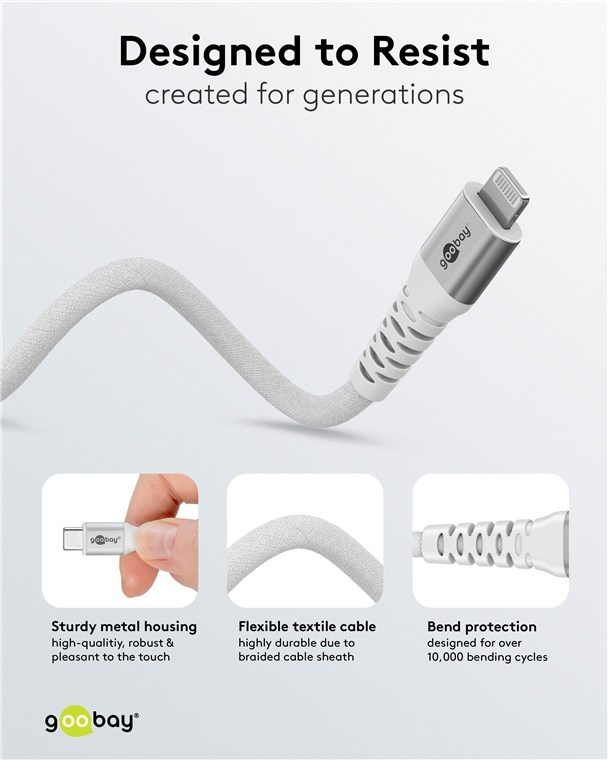 - De forstærkede metalstik med knækbeskyttelse er designet til over 10.000 bøjningscyklusser, hvilket gør Lightning-kablet ekstremt holdbart