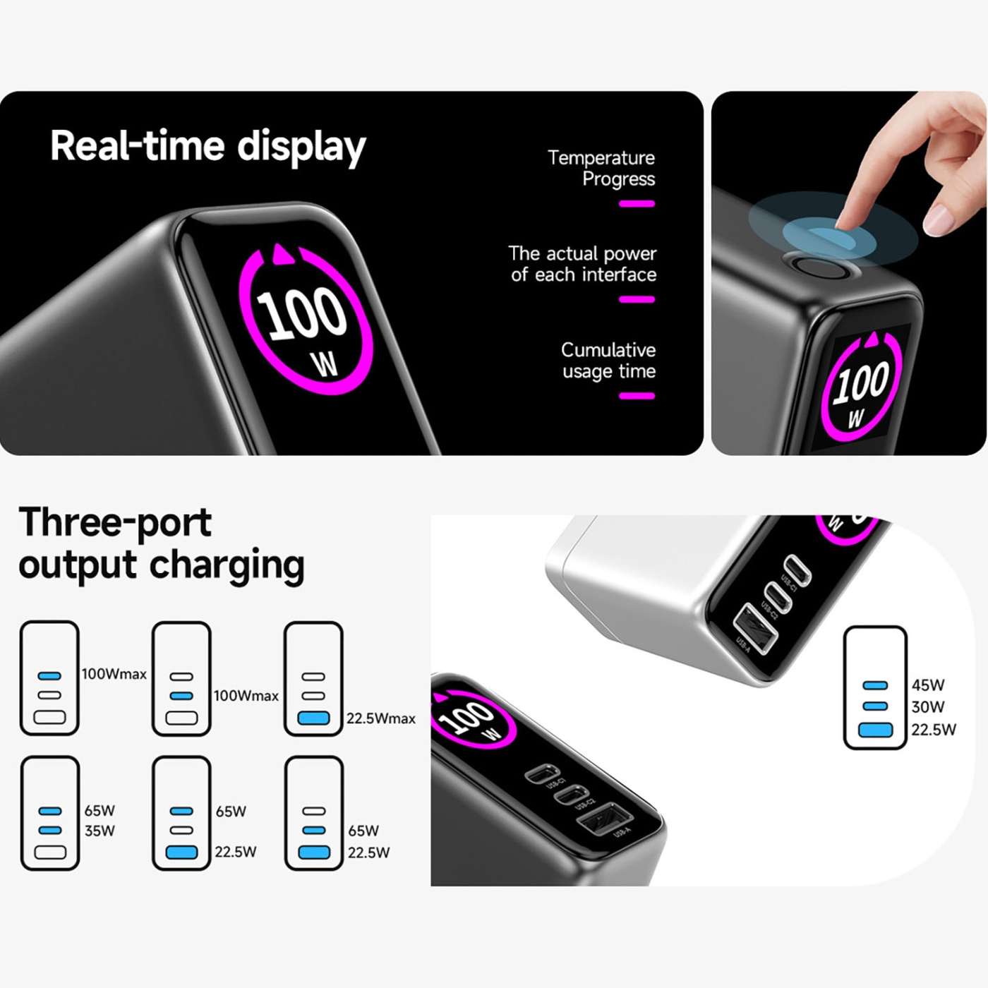 Upptäck den perfekta följeslagaren för dina resor och hektiska dagar: 100W väggladdare med GaN-teknik och integrerad LED-skärm. Denna laddare är utformad för dig som vill ha hög prestanda i en elegant och minimalistisk design och gör att du kan ladda smartphones, surfplattor och bärbara datorer samtidigt, utan att kompromissa med hastighet eller säkerhet