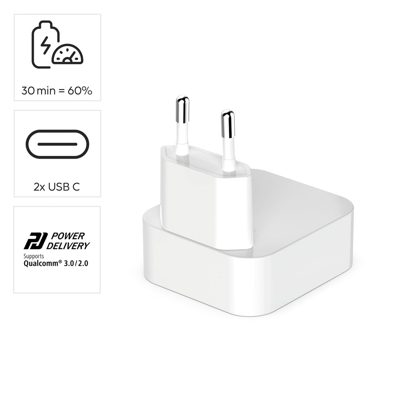 Opladerens kompakte design med et sammenklappeligt Euro-stik gør den nem at have med i enhver håndtaske eller lomme. Den er fremstillet af galliumnitridkomponenter og giver en supereffektiv ydeevne med minimal varmeudvikling. System-on-Chip-designet giver mulighed for en lille og let oplader uden at gå på kompromis med effekten.