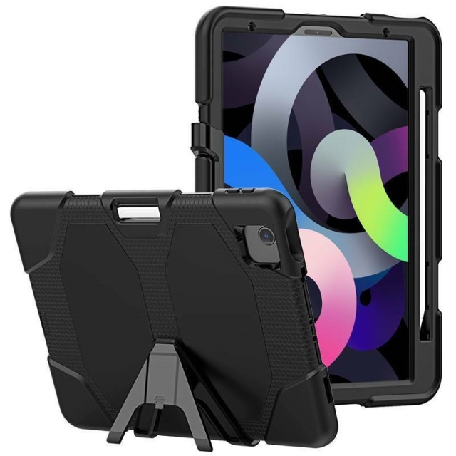 Stødabsorberende skal til din iPad Air gen 4 2020. Skallen giver en komplet beskyttelse, da den leveres med en skærmbeskyttelse til forsiden, ekstra stødbeskyttelse i kanterne og en bagside i hård plast. På bagsiden har du også en lille stander, der kan foldes ud.