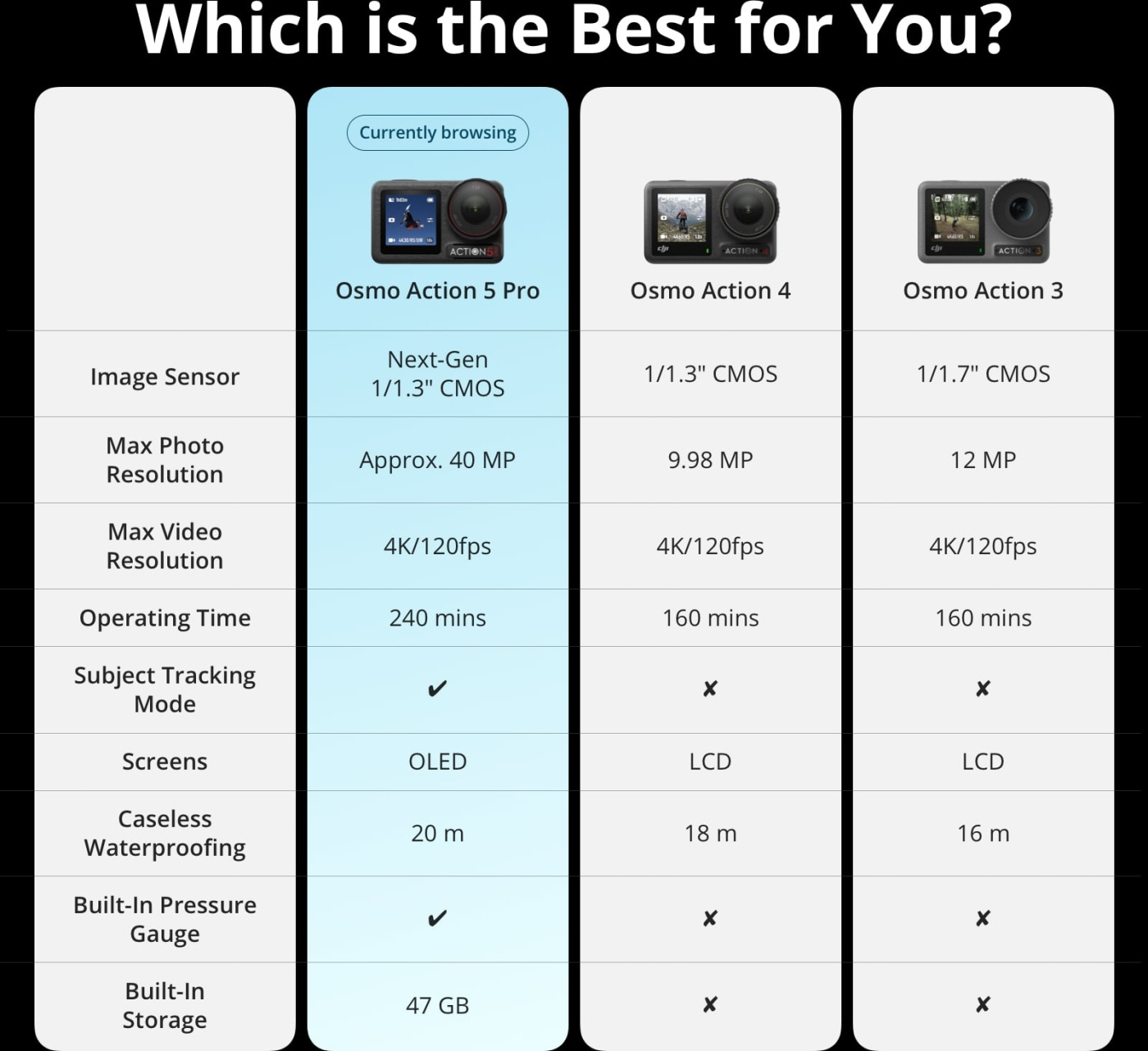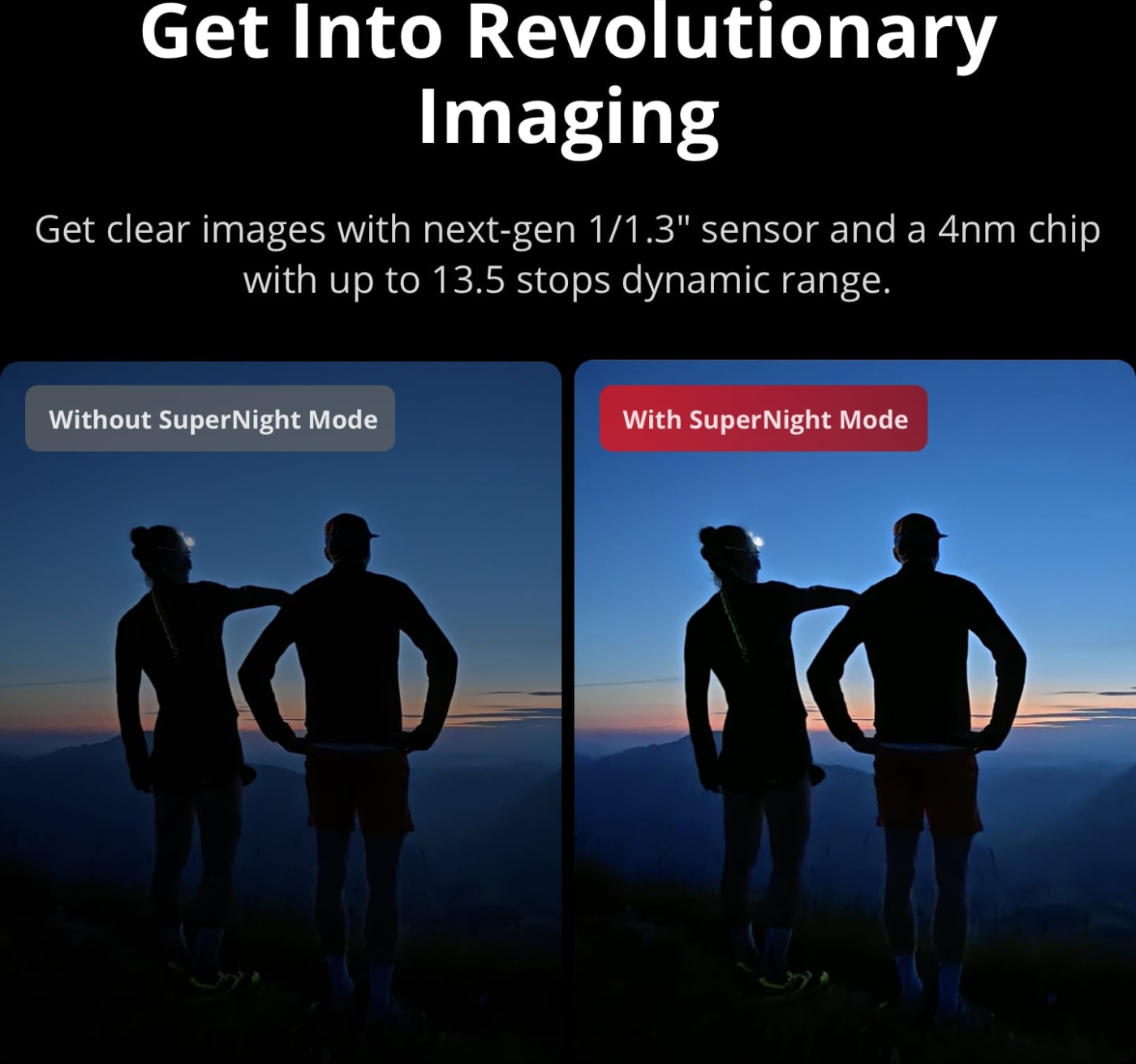 - Ny generation af 1/1,3-tommers CMOS-sensor: Action 5 Pro tilbyder en dynamisk rækkevidde på op til 13,5 blændetrin for at sikre en fantastisk billedkvalitet.