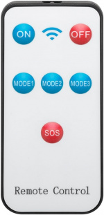 - Fjernbetjening med 6 knapper: On = 100 %, Off, Mode 1 = 75 %, Mode 2 = 50 %, Mode 3 = stroboskop, SOS (rødt lys), rækkevidde ca. 5 m, inkl. 1x knapcelle CR2025