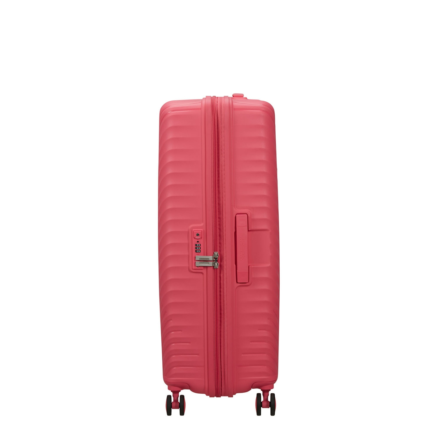En rummelig og sikker kuffert fra American Tourister med udvidelig kapacitet og TSA-lås.