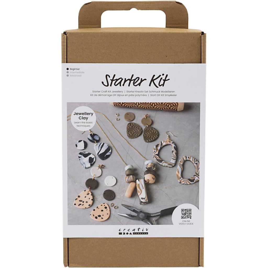 Starter Craft Kit Jewellery Clay, smykker, 1 pakke. Med dette sæt lærer du at lave unikke smykker af blød og fleksibel fin lerpolymer. Sættet indeholder alle de materialer og instruktioner, du har brug for. Indhold: Smykkeler, udstikker, rulle, mønsterrulle, modelleringsværktøj, nål, lerkniv, sandpapir, smykketang, ørekroge, ørestikker, o-ringe, halskæde.